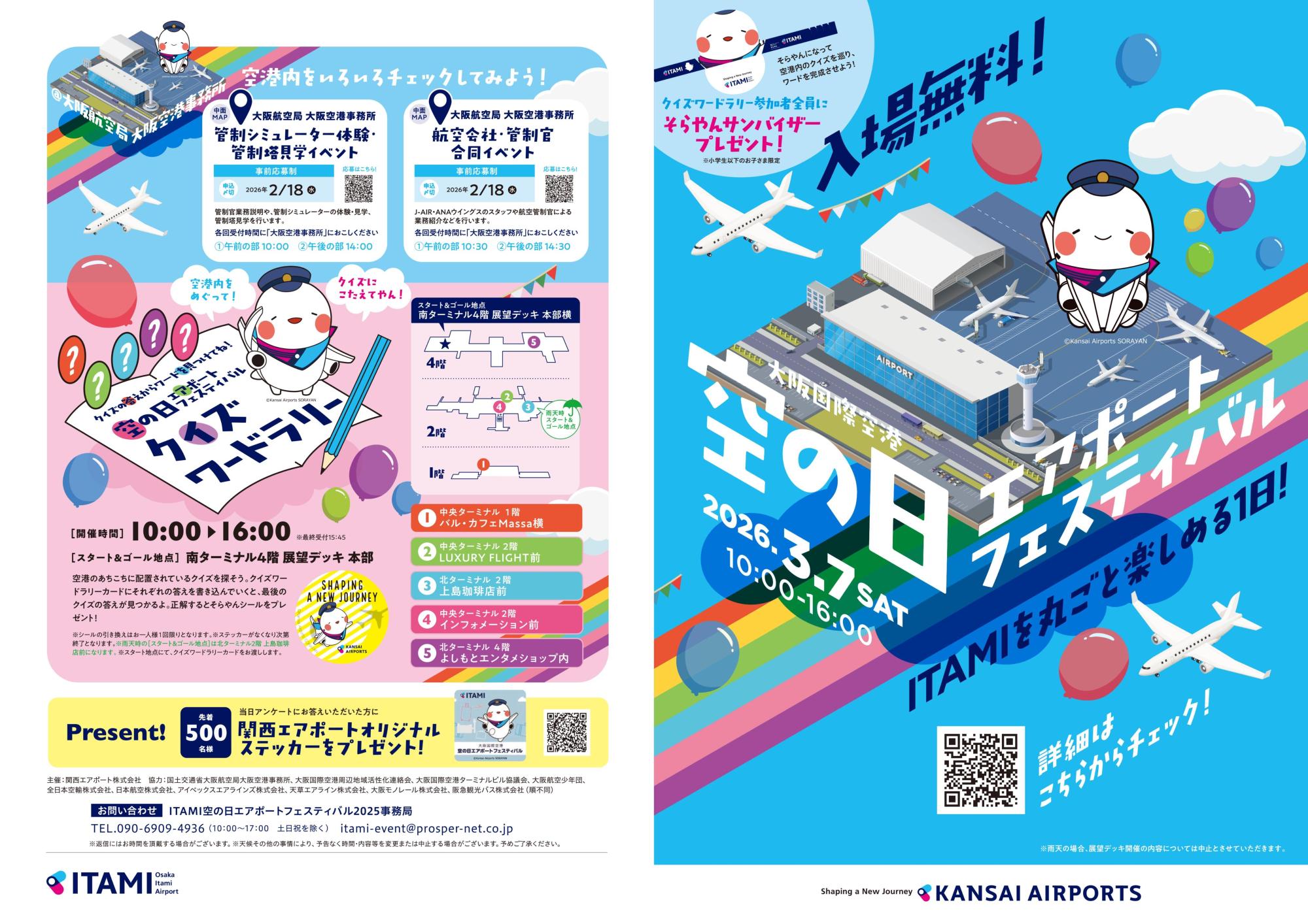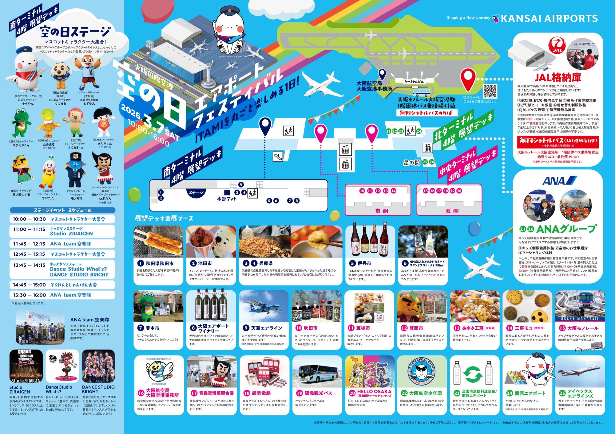 航空会社の格納庫見学、管制塔見学、関西エアポートグループ公式キャラクター「そらやん」などが登場するマスコットキャラクターステージ・伊丹市ブース出展など、ご家族やご友人と盛り上がれるイベントが盛りだくさんです。